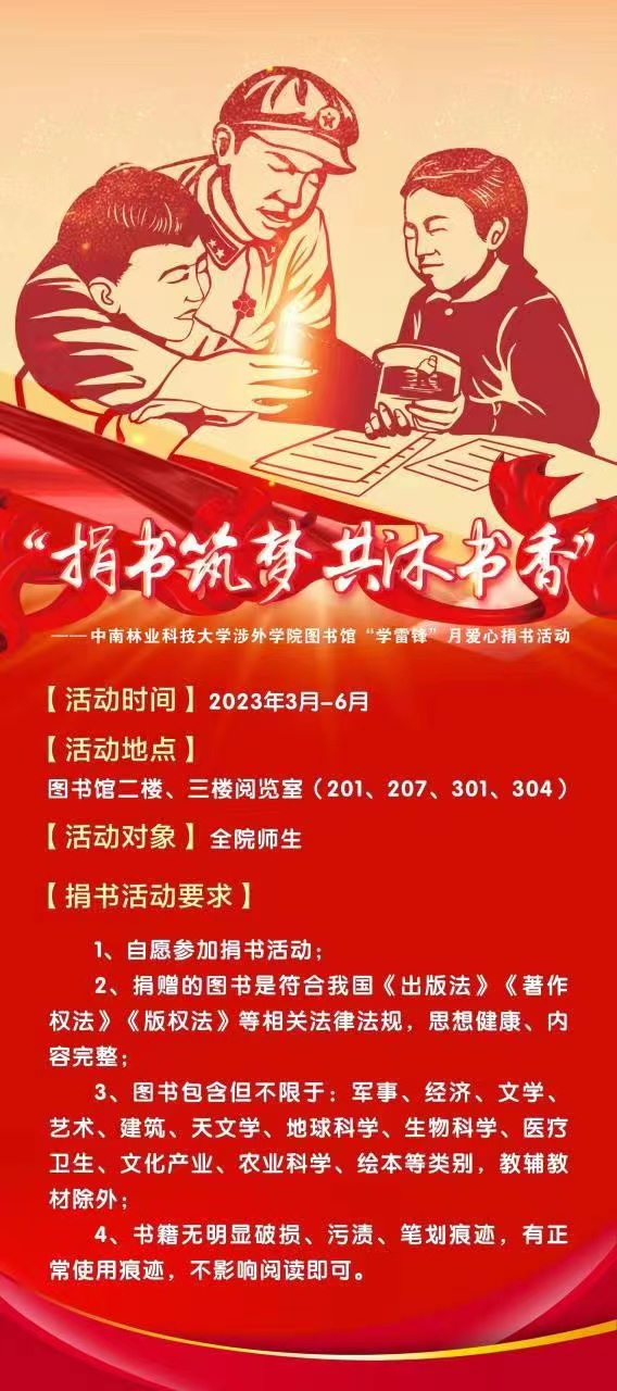 书是我们获得知识的重要途径,也是我们了解世界的一个窗口。好的书籍,往往能够影响一个人的一生。对于我们来说,书架上的一些书籍或许已不再使用,但是对于别的同学,这部分书籍却能给他们带来新知。为此,我院图书馆参照湖南省教育厅《关于做好2023年全省普通本科高校“一校一书——经典、精读、经世”阅读推广活动的通知》的文件要求,以“学雷锋”月为契机,在校内开展爱心捐书活动。
