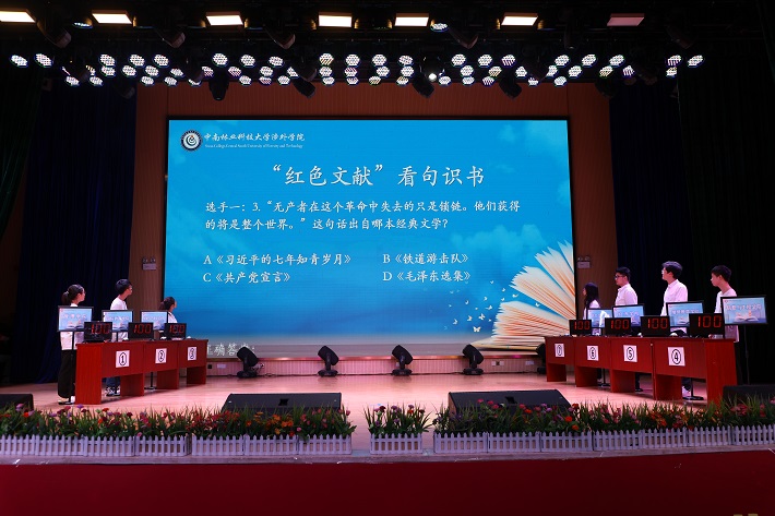 “聆听红色经典音韵,感受历史文化情怀。”本次活动第一个比赛为“红色文献”看句识书,题目选自“一校一书”红色文献推荐书目,来自七个学院的代表选手上台依次答题,采用现场问答的形式,比赛旨在带领大家回顾红色经典,重温经典好句为人生带来的启发和意义,非常考验各位参赛选手的文化内涵,最后恭喜来自经济学院的李霈菁同学获得一等奖,来自管理学院的张刘承郡同学获得二等奖,来自国际教育学院的陈峤屹同学获得三等奖。