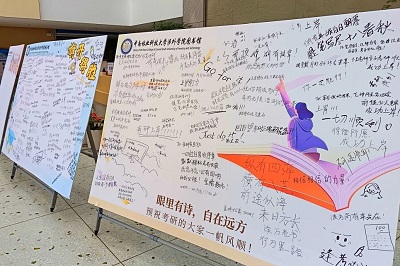 学生们在留言板前驻足,拿起笔写下自己的心愿。笔尖划过板面,字迹或工整,或潦草,内容简短,却都带着对考试的朴素期待。“前程似锦”“考研大捷”“一研为定”“一战成硕”……留言很快布满整块展板。字迹不同,心愿相近,形成一种无声的共振——这是属于考研人的共同心声!