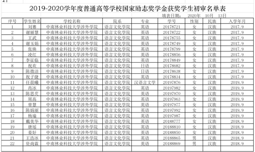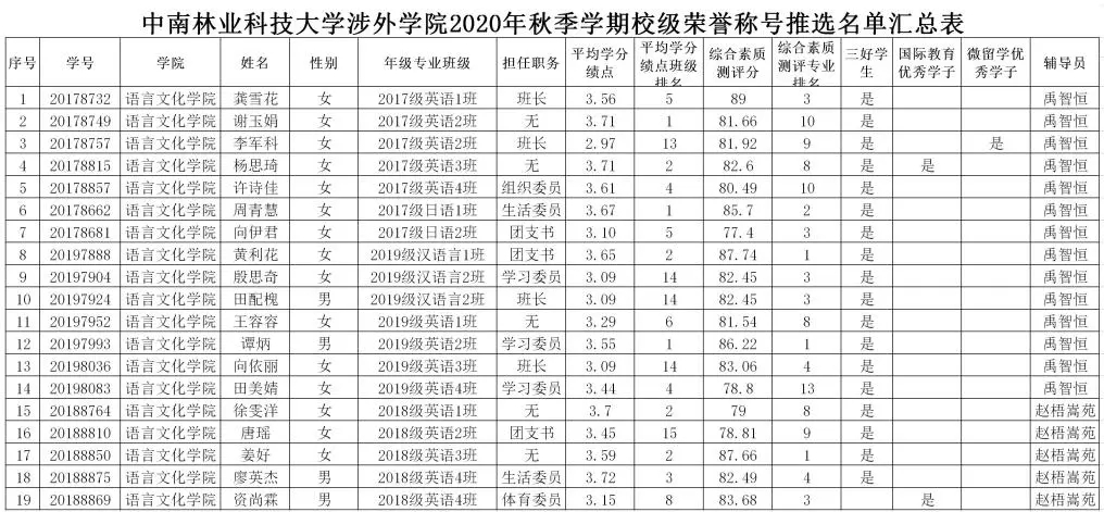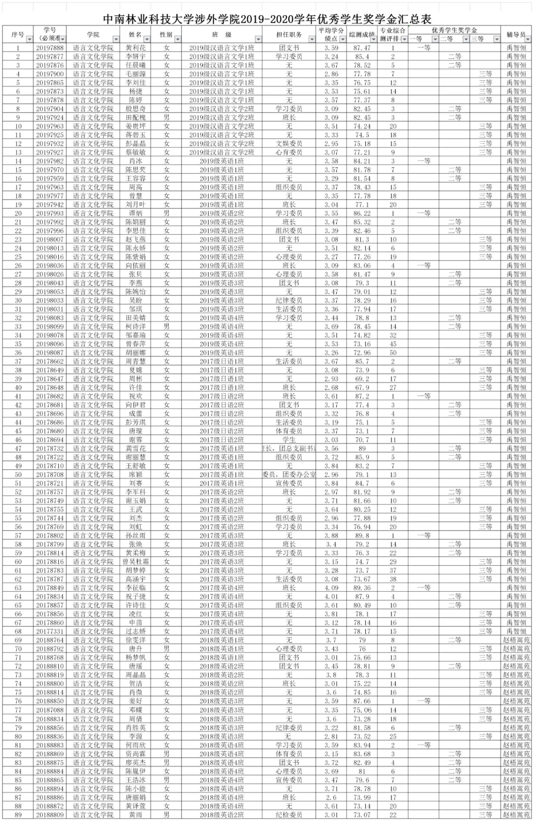 本次工作通过了中南林业科技大学涉外学院2019-2020学年三好学生、2019-2020学年国际教育优秀学子奖、2019-2020学年学生评优评奖单项奖、2019-2020学年优秀学生奖学金、2019-2020学年先进班集体拟获奖初选名单,现予以公示: