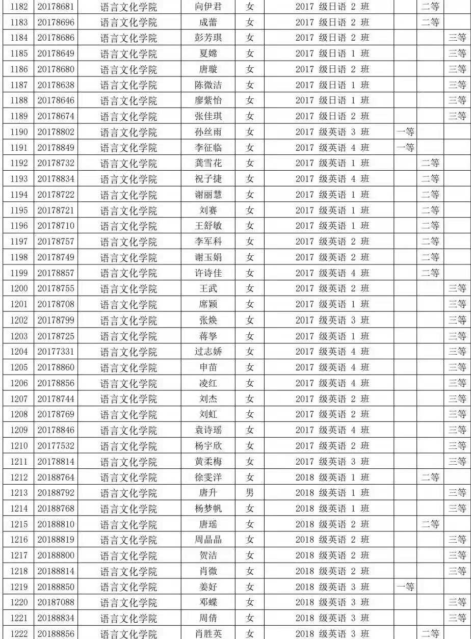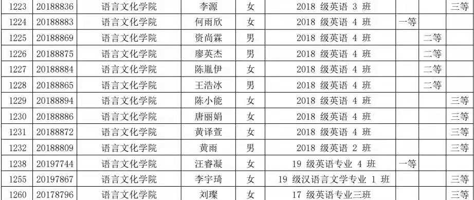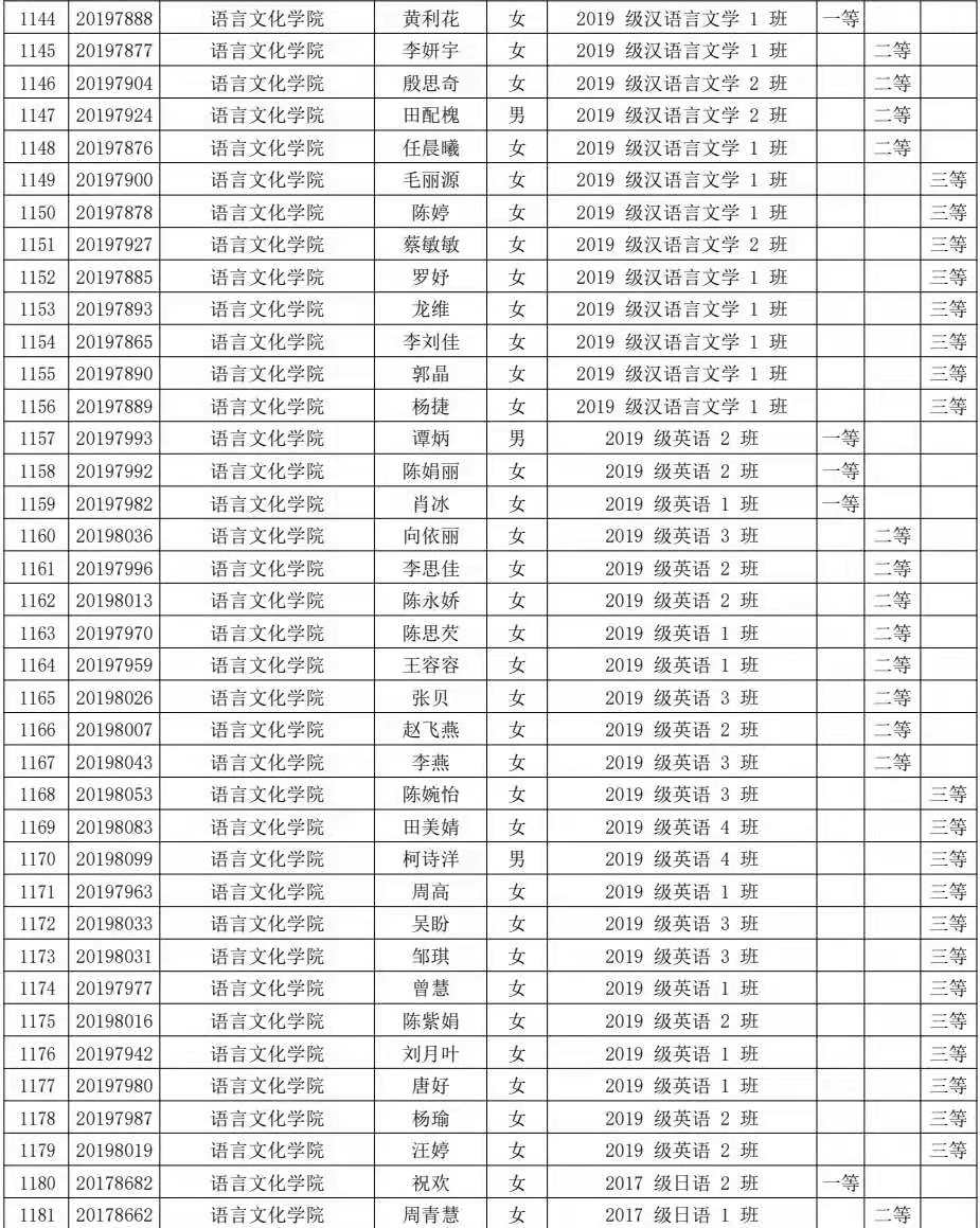 经学生本人申请,班级、辅导员组织选拔推荐,二级学院初审报送至学工处,学工处组织复审并报送至校级荣誉评审委员会评议通过, 本次校级奖学金初步评选的具体名单如下: