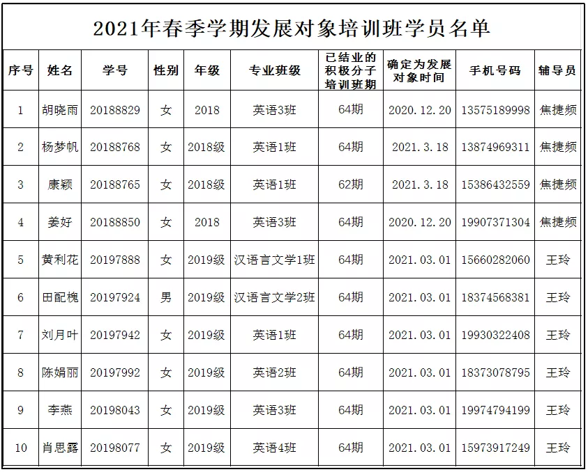 根据学生党员发展工作的相关规定,经语言文化学院学生党支部考察推荐,经学院党总支审议,拟推荐胡晓雨等10位同志参加2021年春季学期发展对象培训班。为进一步增强发展党员工作的透明度,确保新发展党员的质量,根据《中国共产党章程》和《中国共产党发展党员工作细则》,现将2021年春季学期发展对象培训班学员的基本情况予以公示。公示情况如下: