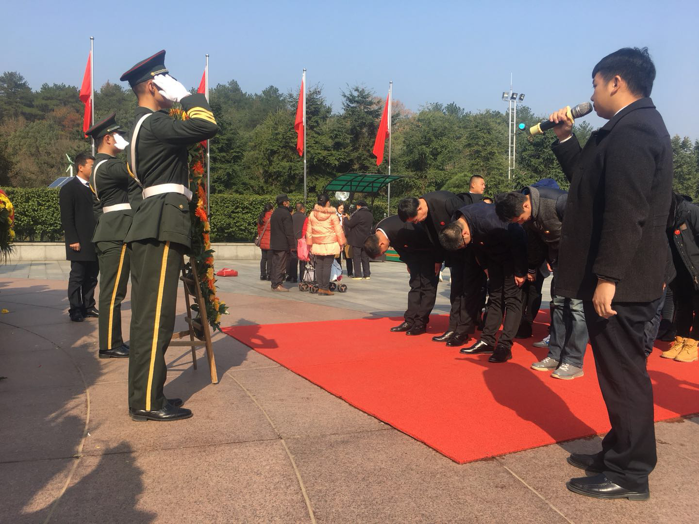 (三)瞻仰伟人铜像 在毛主席铜像广场前,在韶山武警中队仪仗兵的护卫下,外国语学院党总支全体党员伴随庄严肃穆的乐声,满怀着尊崇与敬意,迈着整齐的步伐,向毛主席铜像敬献花篮,向毛主席铜像三鞠躬,围绕铜像一周, 深切缅怀毛泽东同志为民族独立、人民解放和国家富强立下的丰功伟绩, 表达对人民领袖的无限敬仰与深切怀念之情。