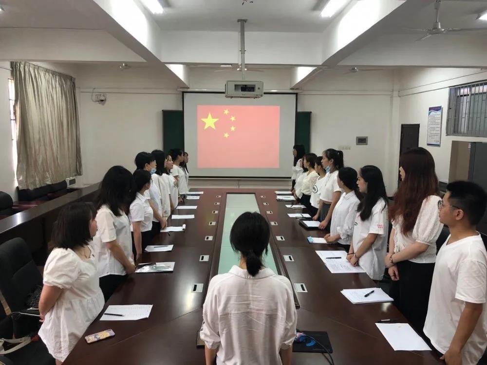 首先,雷茜副书记带领全体毕业生党员,面对着鲜艳的五星红旗,齐唱国歌。
