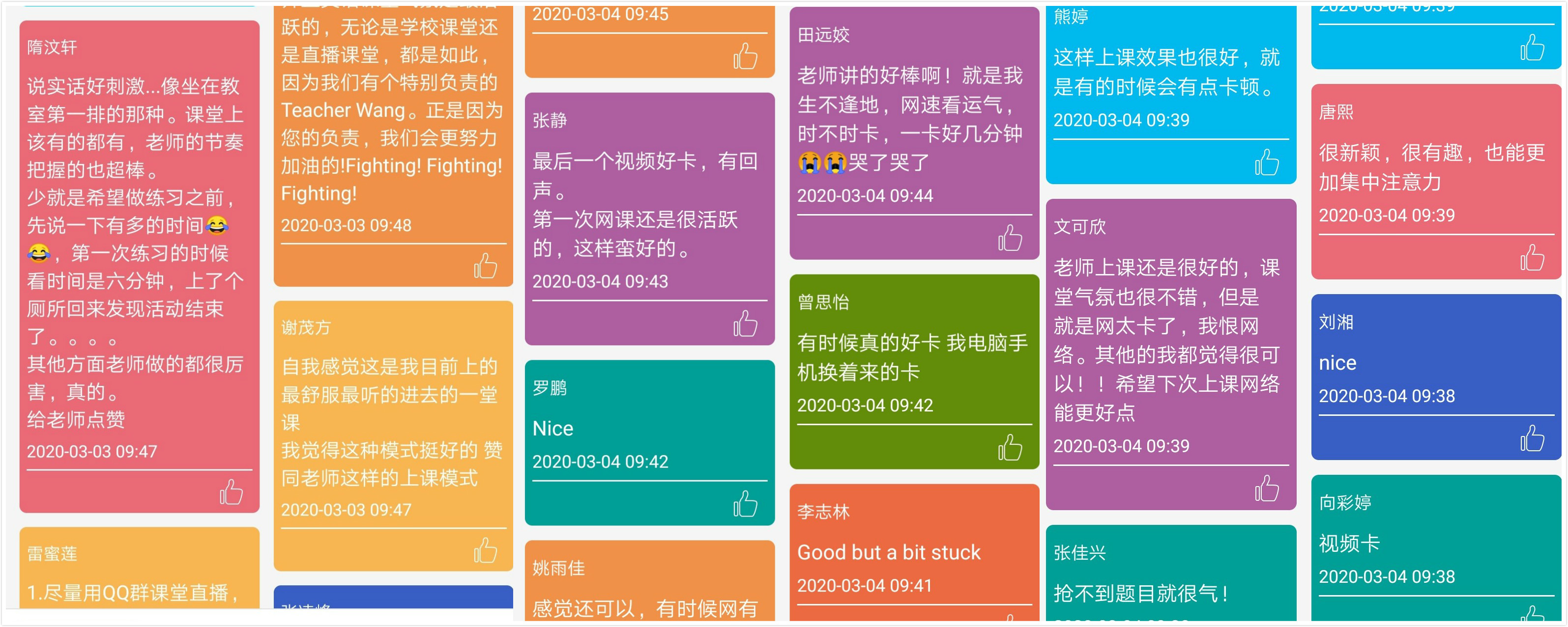 在解决了卡屏、回声、电流音、噪声、断线后被抢麦等技术问题之后,网络课堂的气氛渐入佳境。同学们热情高涨,积极性不输教室里的表现,甚至让一些以往比较腼腆的孩子们更加愿意参与互动和交流。除了认真学习,他们还给我提出了很多中肯的建议,帮助大家改善网课的各种体验。
