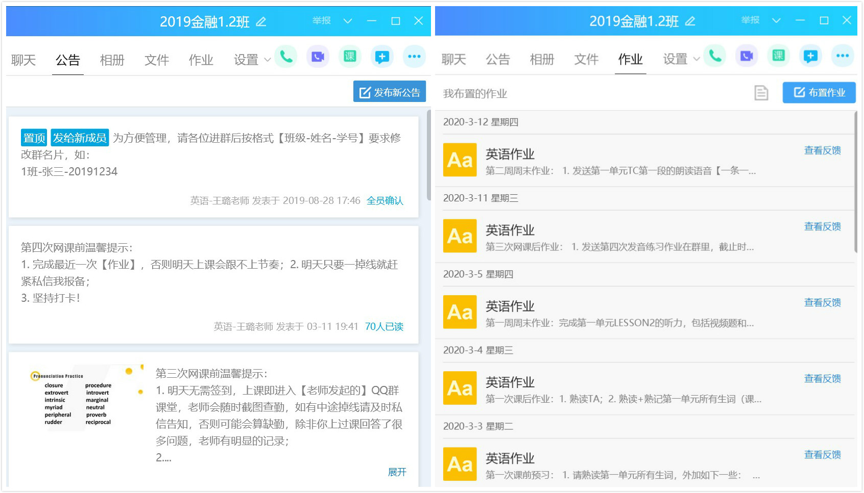在同学们的强烈要求下,从第二次网课开始,我把QQ群内互动为主的授课方式改为全程QQ群课堂直播。为了照顾网速不佳的同学,全面地顺畅到底,索性取消了所有的视频和音频播放,置换成课后作业和课前预习。从此,大家的节奏越来越一致了,并开始了愉快的时光。