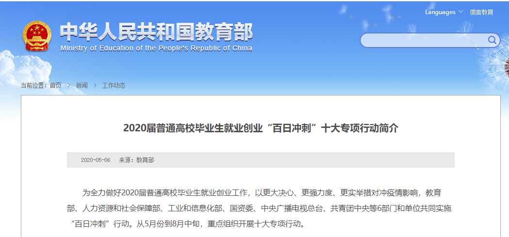 5月6日,由教育部、人力资源和社会保障部、工业和信息化部、国资委、中央广播电视总台、共青团中央等6部门共同主办的2020届普通高校毕业生就业“百日冲刺”行动正式启动,启动仪式上发布了促进高校毕业生就业创业十大专项行动。