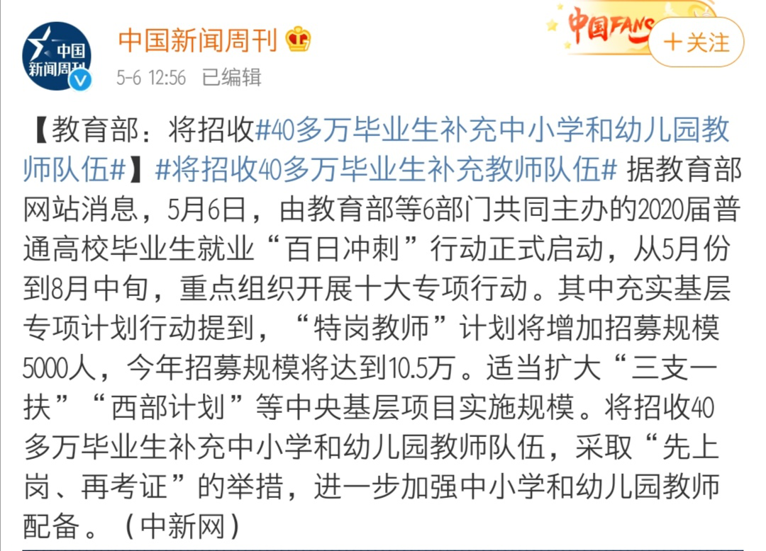 前两日,教育部最新消息发布,将招收40多万毕业生补充中小学和幼儿园教师队伍。教育事业对于我们语言文化学院的毕业生来说,也是相当不错的选择哦!