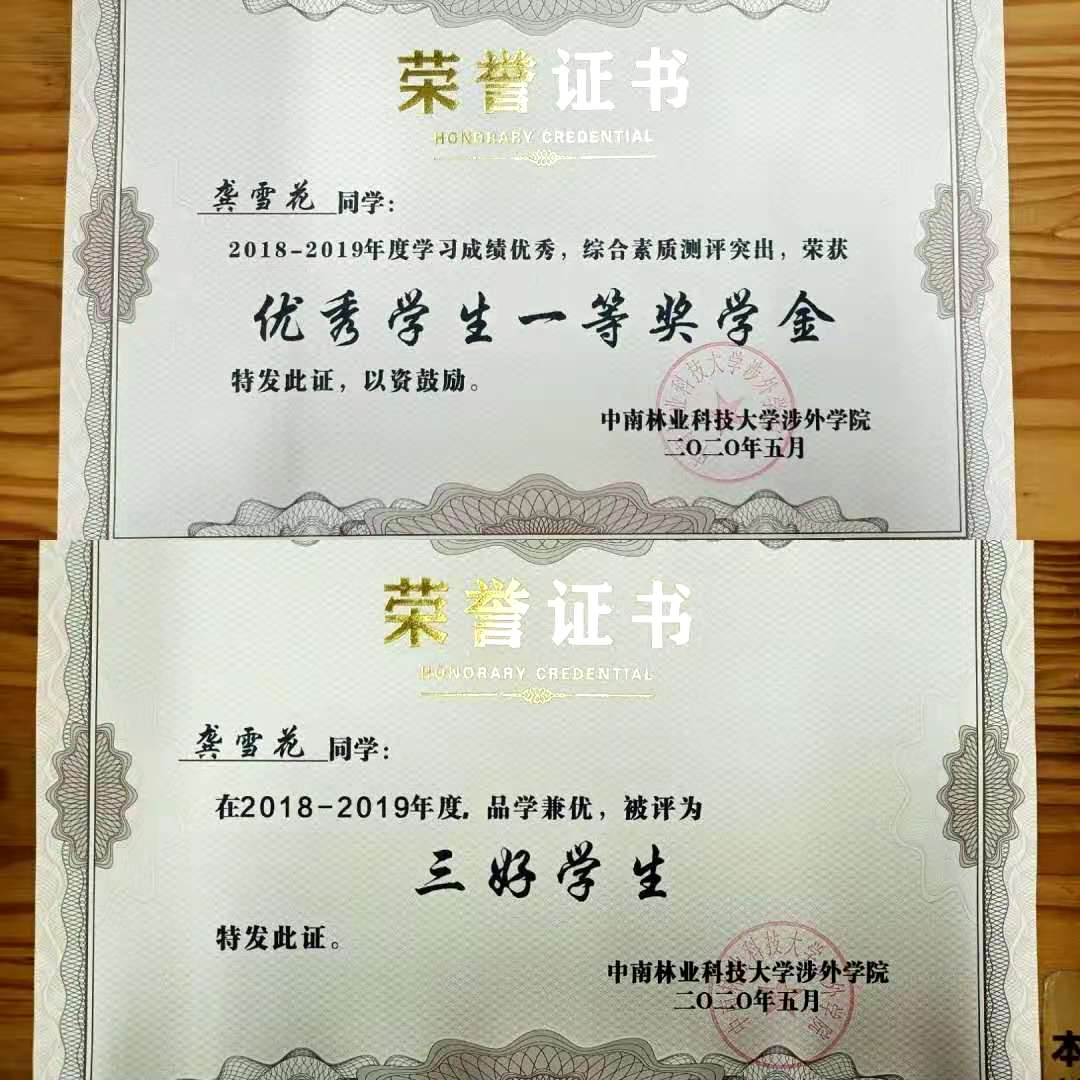 2020年5月,获“中南林涉外向上向善好青年”荣誉称号;