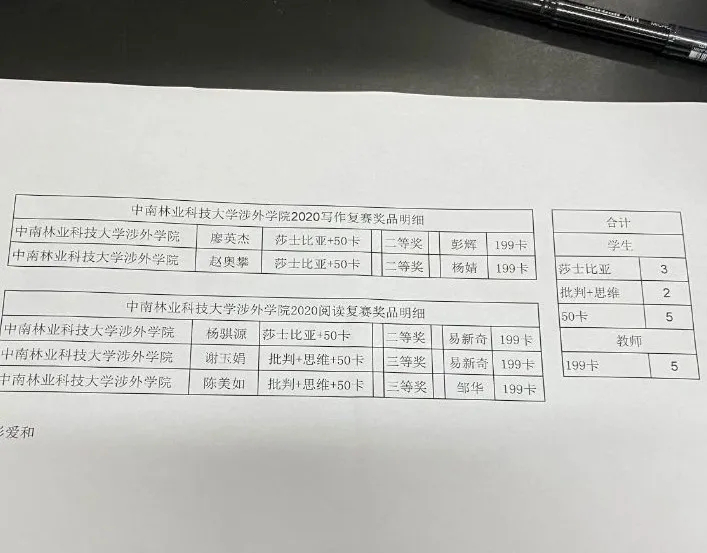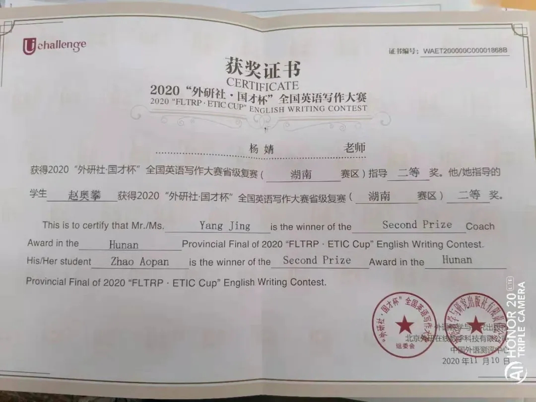 为提高我院大学生英语水平,激发广大学生学习英语的兴趣,鼓励英语学习成绩优秀的大学生,我院老师积极指导学生参加大学生英语学科竞赛,近日,我院学子连获佳绩:赵奥攀荣获全国大学生英语竞赛湖南省赛区决赛C类一等奖、2020“外研社杯”全国英语写作大赛湖南赛区复赛(本科组)二等奖;廖英杰获得2020“外研社杯”全国英语阅读大赛湖南赛区复赛(本科组)二等奖;杨骐源获得2020“外研社杯”全国英语阅读大赛湖南赛区复赛(本科组)二等奖;谢玉娟、陈美如获得2020“外研社杯”全国英语阅读大赛 湖南赛区复赛(本科组)三等奖。