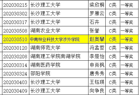 全国大学生英语竞赛湖南省赛区决赛C类一等奖(获奖信息从左到右依次为:考试号、学校、获奖人、指导老师、所获奖项)