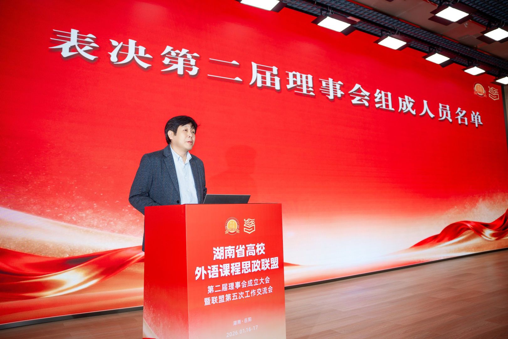 为深入贯彻《高等学校课程思政建设指导纲要》精神,全面落实立德树人根本任务,积极推动高校外语课程思政建设专业化、常态化发展,2026年1月16日-17日,湖南省高校外语课程思政联盟第二届委员会成立大会暨联盟第五次工作交流会在岳阳成功举办。语言文化学院和新视域文化产业学院院长胡东平教授、副院长李小霞教授受邀参加本次盛会,与来自全省各高校的外语院系负责人及骨干教师齐聚一堂,共话外语课程思政建设新路径。
