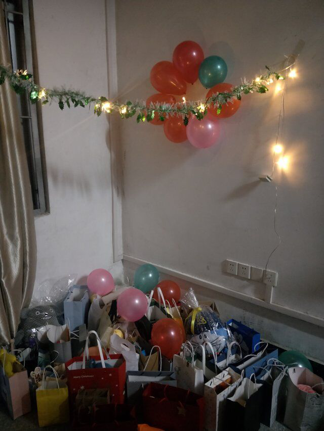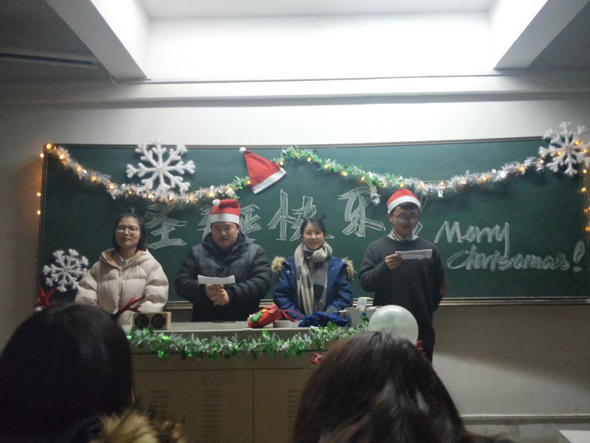 布满了气球和彩灯的教室格外的温馨和欢乐。在欢乐的1103教室外语系又迎来了一年一度的圣诞节及总结表彰大会。 来到外语系学生会也有了一学期,本次的大会主持是四位优秀的小干事。