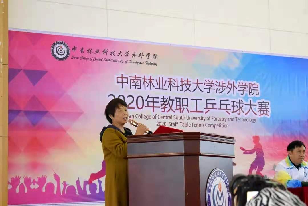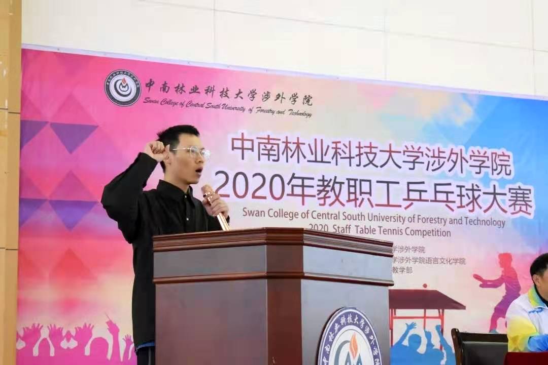 11月19日下午,2020年度中南林业科技大学涉外学院教职工乒乓球比赛在学校体育馆准时开始,本次教职工乒乓球比赛由中南林涉外学院主办,语言文化学院承办,党政办及体育教学部协办,中南林业科技大学涉外学院董事长朱定强、院长周志宏、党委书记章元日、副院长马宗艳、党委副书记孟志波、副院长张康龙、行政总监叶国安、院长助理刘诗福和各二级学院院长、书记出席本次比赛开幕式。