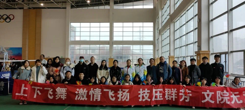 在比赛开始之前,我们的啦啦队早已就位,时刻准备着呐喊加油。随着比赛的开始,“上下飞舞,激情飞扬;技压群芳,文院无双”的口号在体育馆响云霄。