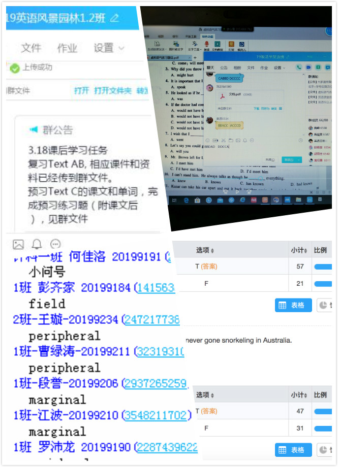 总之面对在线教学的新要求,大学英语教研室全体教师能做到加大对学生学习的引导,让学生会自主学习,能“带着问题、有目的地学习”。为保证教学质量,老师们不仅仅授课,还做了答疑指导,再辅之阶段性小测验,及时互动,做到教学质量不受疫情影响。