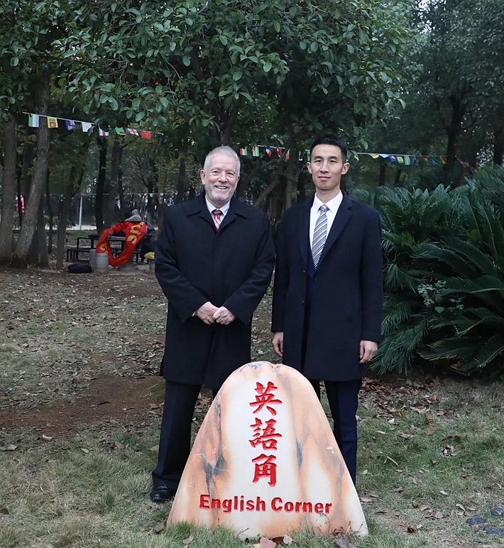 紧接着,艾伦·卡洪博士参与了语言文化学院举办的英语角活动。现场气氛热烈,卡洪博士与同学们热情互动,耐心回答学生们的提问,感受文化交融的魅力。他对学院开展英语角活动表示高度赞赏,也对中南林涉外学子的学习热情表示充分肯定,并给英语角寄语“A place for spoken English, A bridge to the world ”。随后,合影留念。