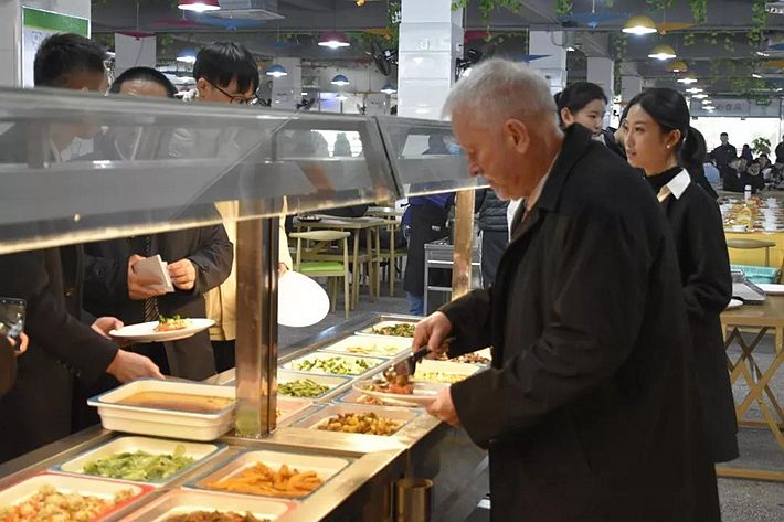 中午,艾伦·卡洪博士和同学们在学院第一食堂共进午餐。