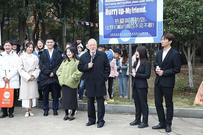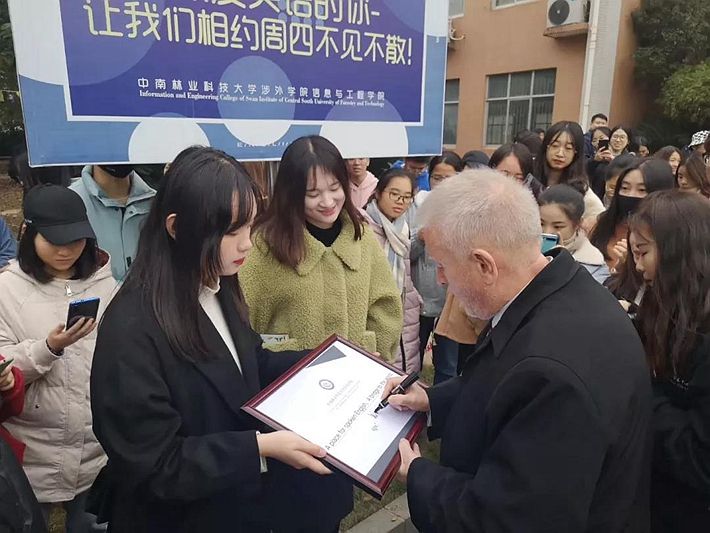 紧接着,艾伦·卡洪博士参与了语言文化学院举办的英语角活动。现场气氛热烈,卡洪博士与同学们热情互动,耐心回答学生们的提问,感受文化交融的魅力。他对学院开展英语角活动表示高度赞赏,也对中南林涉外学子的学习热情表示充分肯定,并给英语角寄语“A place for spoken English, A bridge to the world ”。随后,合影留念。