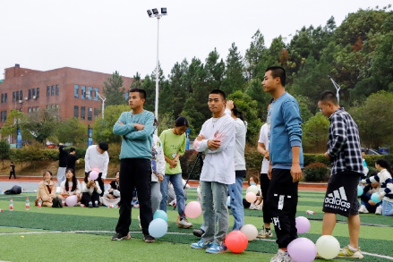 围湖跑热身后,学生干部在组长带领下分组进行趣味游戏