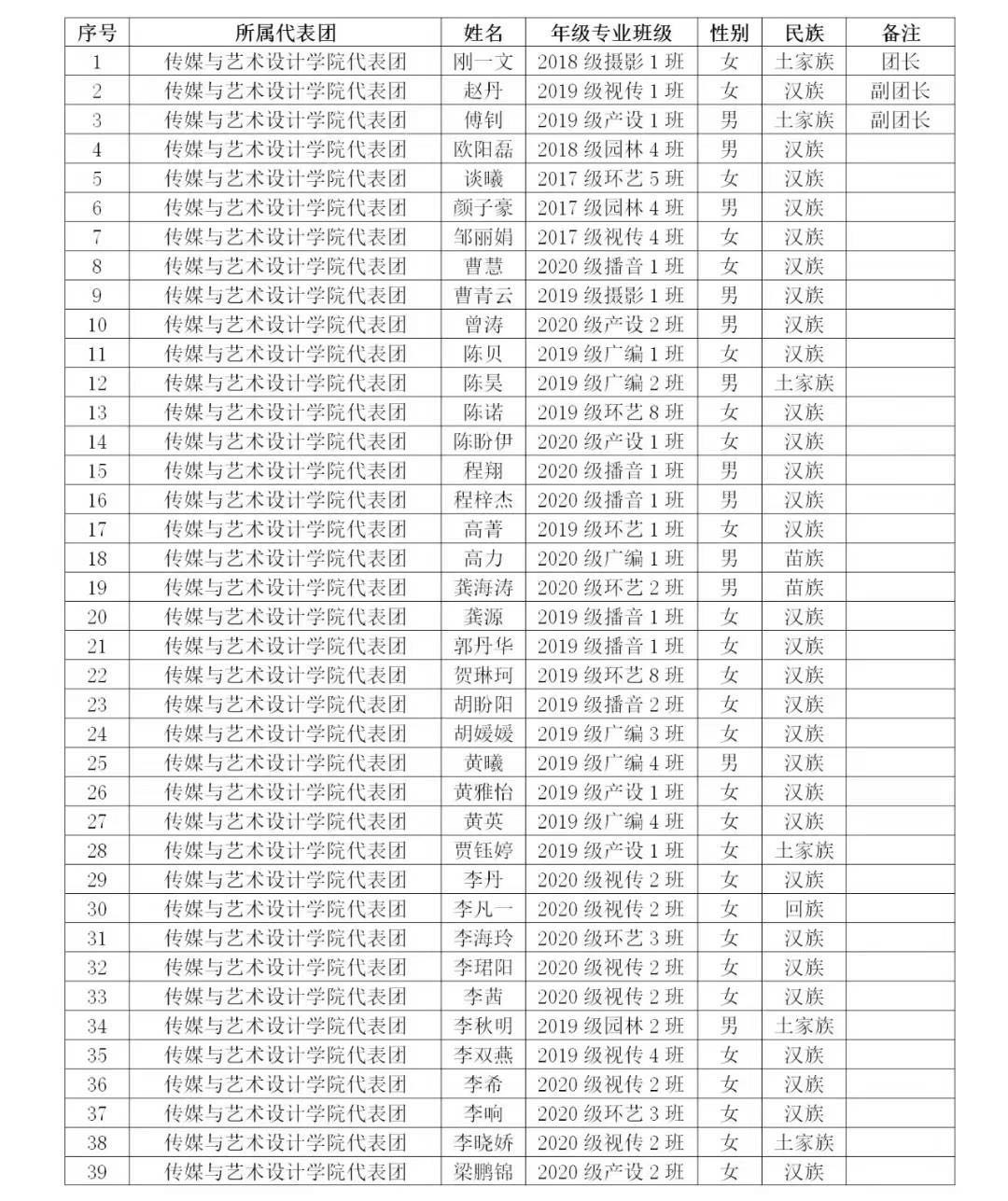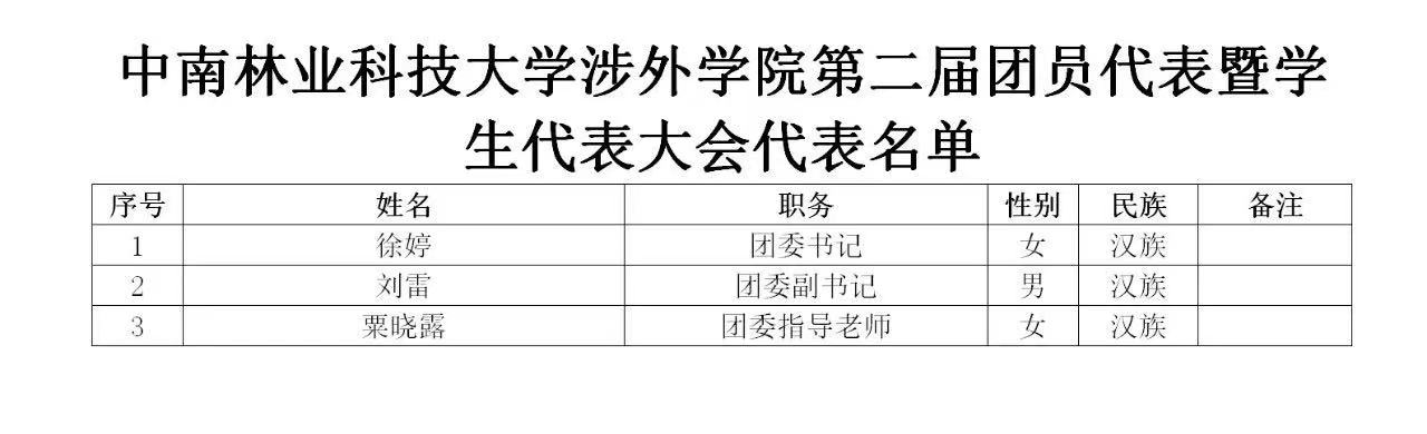 根据《关于选举中南林业科技大学涉外学院第二次团员代表暨学生代表大会代表的通知》的相关要求,严格按照代表选举产生办法,认真贯彻民主集中制原则,经过第二届团员代表暨学生代表大会代表资格审查组审查认定,现将中南林业科技大学涉外学院第二届团员代表暨学生代表大会代表名单进行公布。