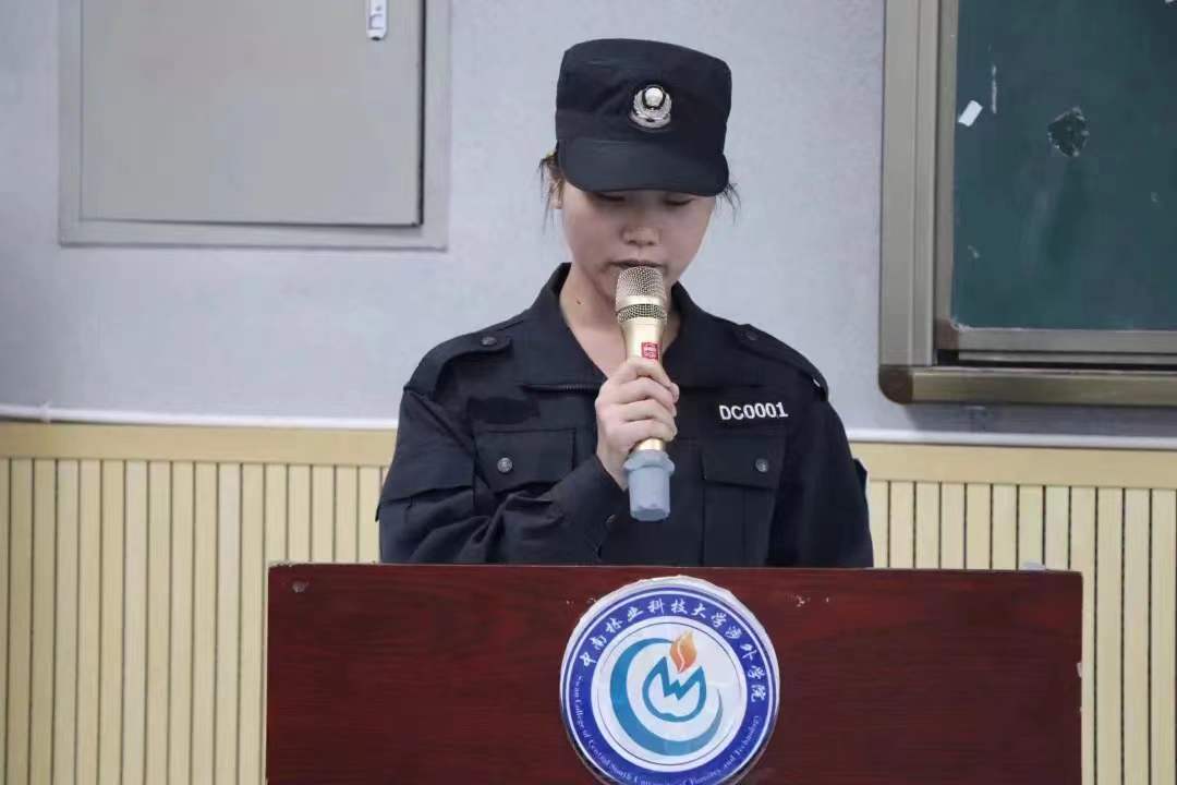 大会第二项,校园文明督察队队长汇报总结。这一年来,校园督察队的发展离不开队长们的指导。督察队内的三位队长耐心指导队伍的发展,严格要求队伍的纪律,他们始终将督察的事摆在第一位。第十二届校园文明督察队队长王容容讲述了自己在队伍中工作的感悟,同时也表达出自己对督察队的不舍,并且希望每个队员不忘初心的走下去。
