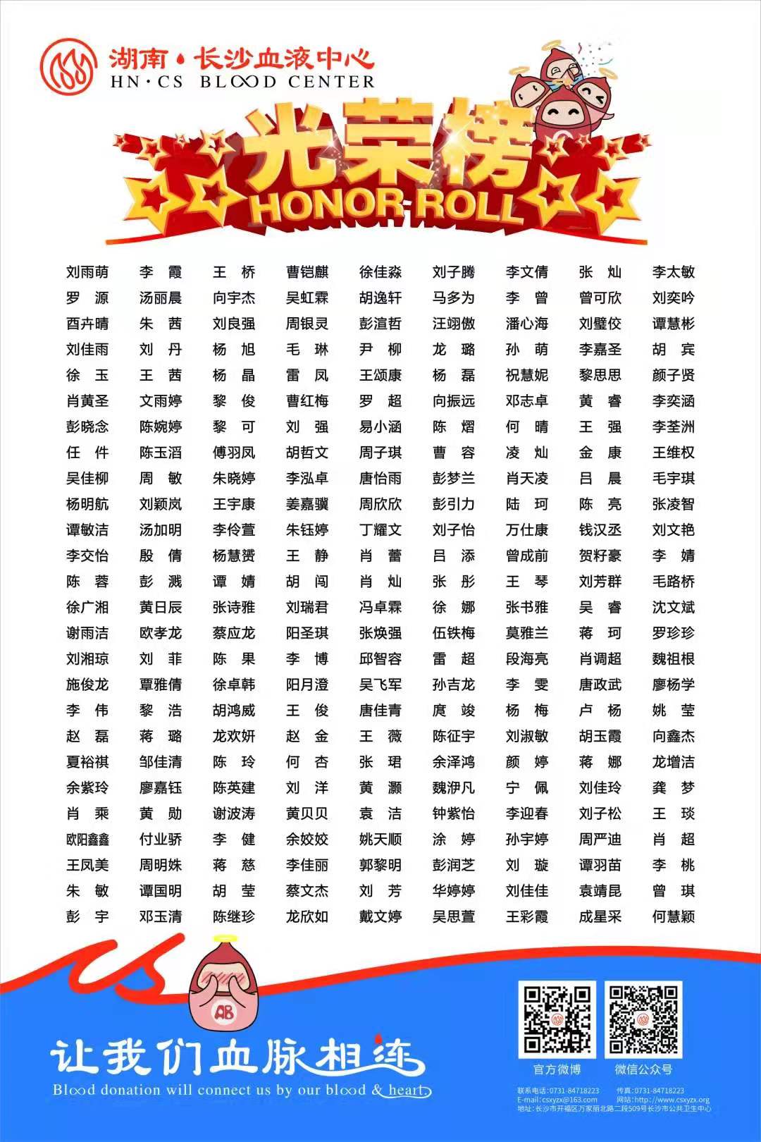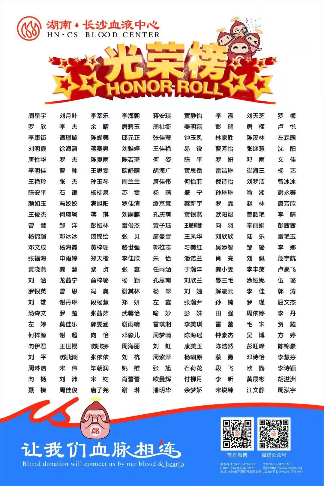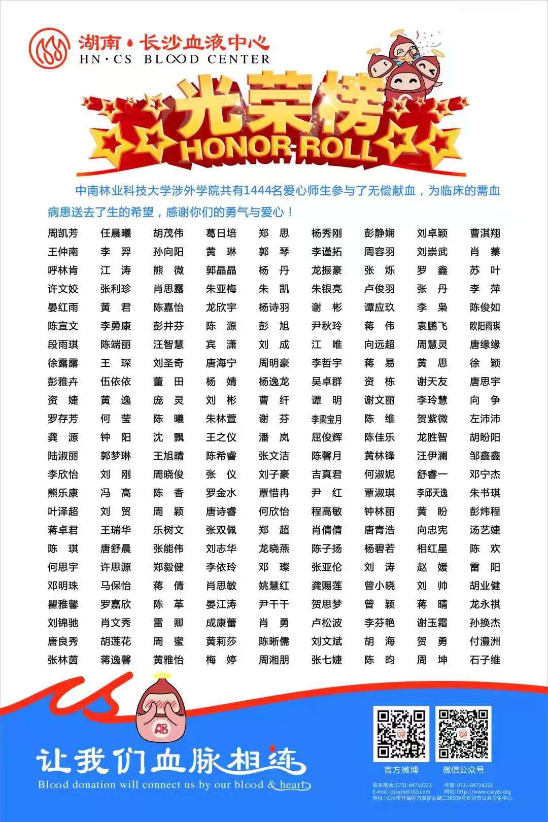 在2019年—2020年中,中南林业科技大学涉外学院学工处、团委多次积极配合长沙市血液中心组织开展“无偿献血志愿活动”,号召大家积极参与,并取得了良好反响,为全市的医疗用血安全做出了积极的贡献,得到了长沙市血液中心的高度赞扬。为此长沙市血液中心为我们送来了代表光荣的名单。