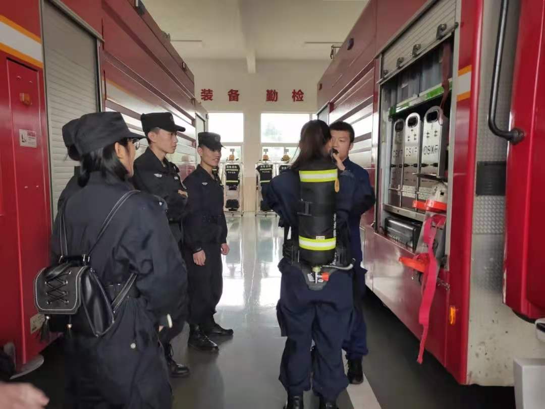 督察队员们在消防员的带领下参观了他们的装备库,了解了各种救援的装备和消防车辆。