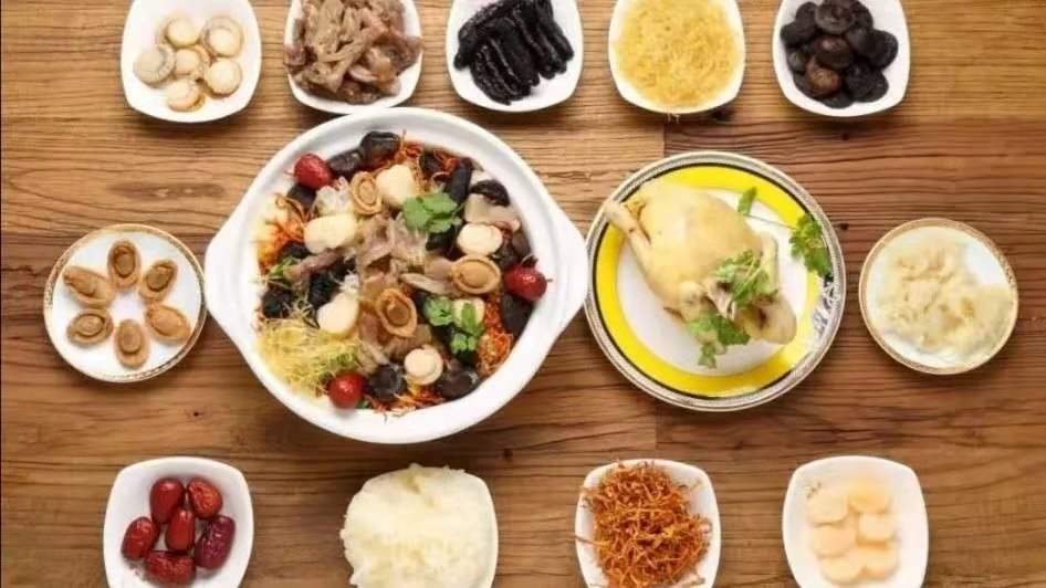 海参、鲍鱼、鱼翅、干贝、花胶、蛏子、猪肚、冬菇…金黄浓稠的汤汁里都是各种珍贵海味的精华。
