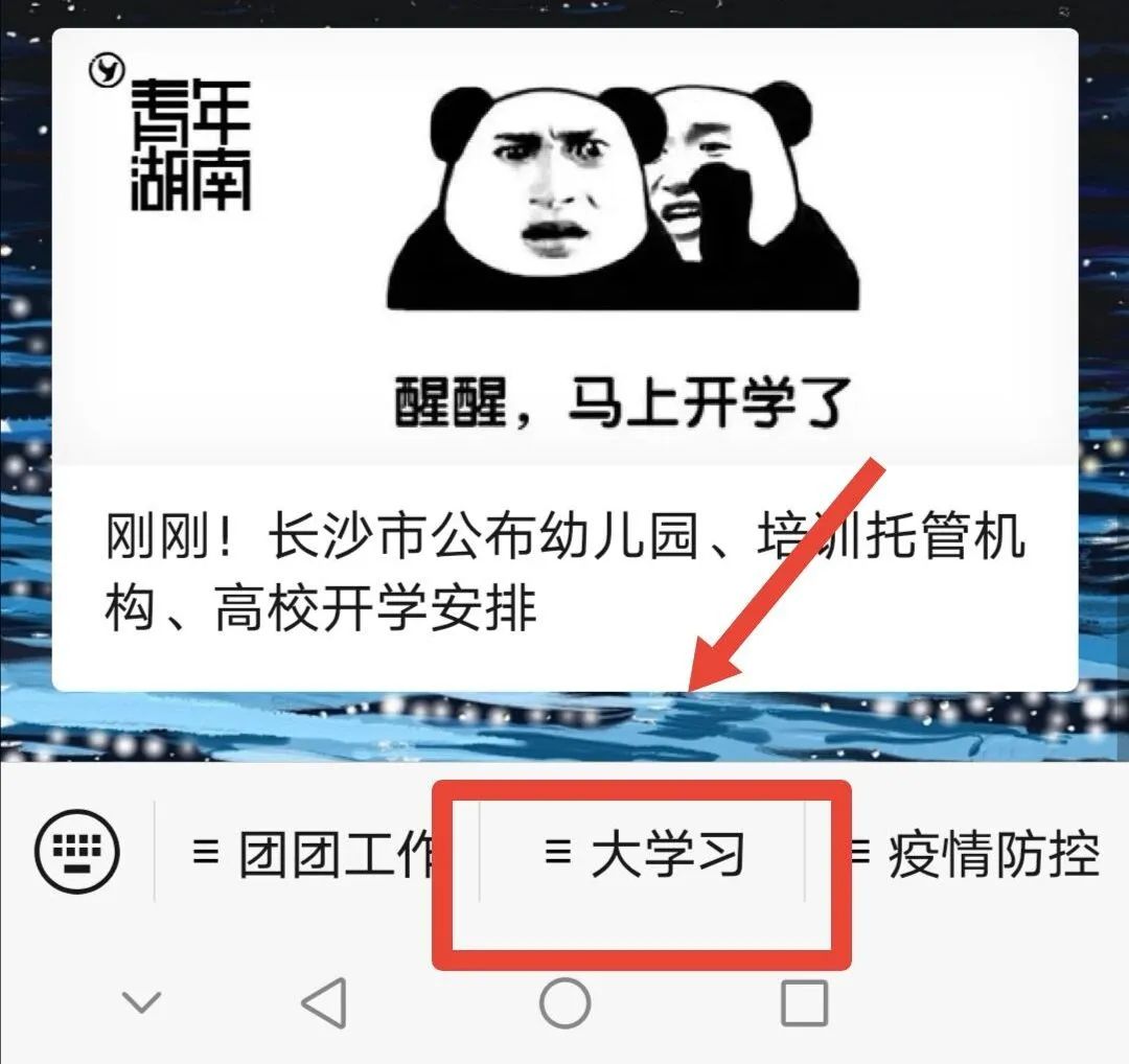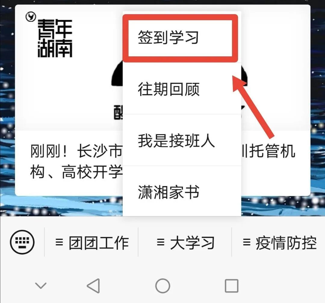 ②进入“青年湖南”公众号后,点击下方中间的“大学习”,再点击“签到学习”;