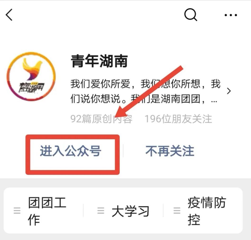 ①打开微信,搜索并关注“青年湖南”微信公众号(微信id:GQTHNS);