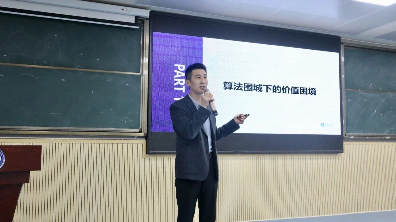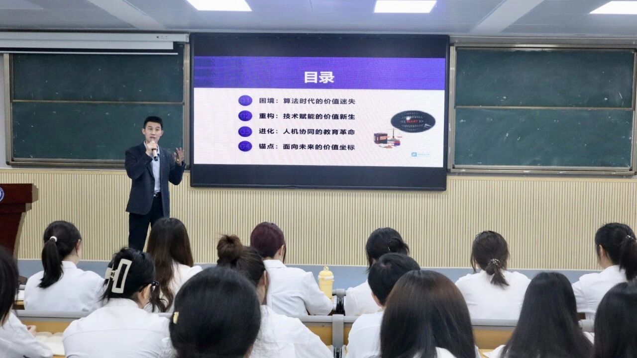 张康龙副院长以新时代发展对青年大学生的学习所产生的影响和科技发展对民营企业的影响为切入点,引出了今天的课题—AI时代青年大学生价值观的重塑与超越。