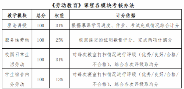 《劳动教育》课程由学生工作处统筹实施,任课教师根据《劳动教育》课程教学大纲规定的考核办法执行,每学期做好材料存档工作。《劳动教育》课程的最终考核结果由任课教师于2026年秋季学期结束前录入教务系统。