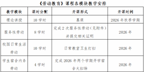 根据专业人才培养方案设置要求,每位学生必须完成2学分(32学时)的《劳动教育》课程,具体内容及形式如下: