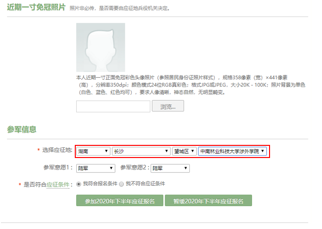 2.应征地需选择湖南长沙望城区中南林业科技大学涉外学院,学院征兵办公室登录系统方可查看应征入伍同学的报名信息并进行审核。