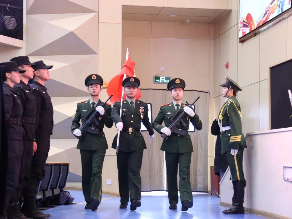 伴随着雄壮的《中华人民共和国》,大会拉开帷幕,全体起立,奏唱国歌。国歌唱闭,随着一声“标兵就位,迎军旗”,会场响起慷慨激昂的《中国人民解放军进行曲》,三名礼兵护卫着八一军旗缓缓走过,全体肃立。