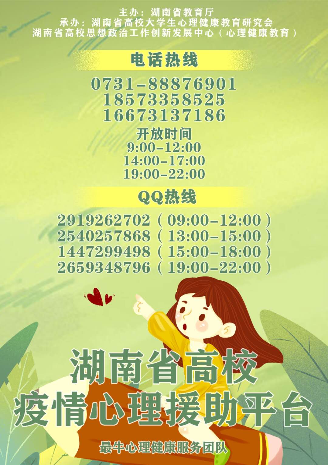 面对疫情,如何做好心理健康教育,守护学生心理安全防线?近期,湖南省教育厅、省委教育工委就做好疫情防控期间高校心理健康服务工作进行系统谋划,积极整合省内高校心理服务资源,组织省内高校开通心理服务热线和网络咨询,搭建高校疫情心理援助平台,为广大师生和社会公众提供了大量富有成效的心理健康服务,坚定全社会战“疫”信心。