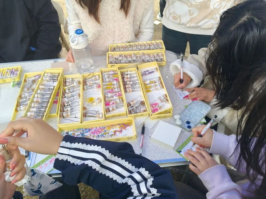“夸夸镜”前,学子们通过书写自我肯定便签贴于镜面,在凝视与阅读中强化自我认同;“漂流瓶”活动中,大家将温暖寄语或减压心得投入瓶中传递,让善意与经验在校园间流动;“任意门”区域设置不同主题的心理倾诉角,学子可走进“门内”诉说烦恼,收获同伴或志愿者的倾听与鼓励;“香囊”环节学子在亲手制作中放松身心;“拼贴诗”活动则以剪裁拼接创作专属诗句,用文艺表达释放内心思绪。