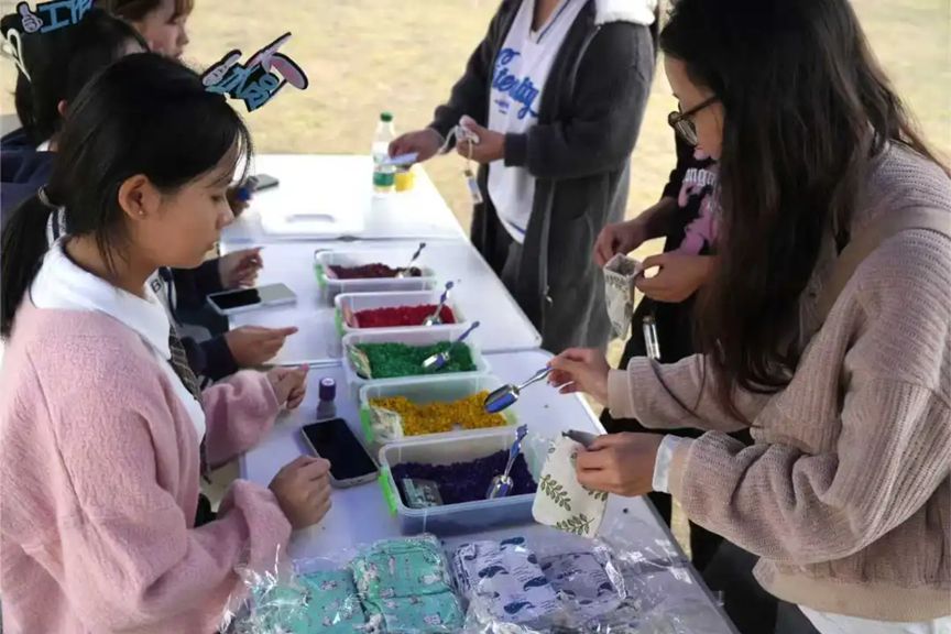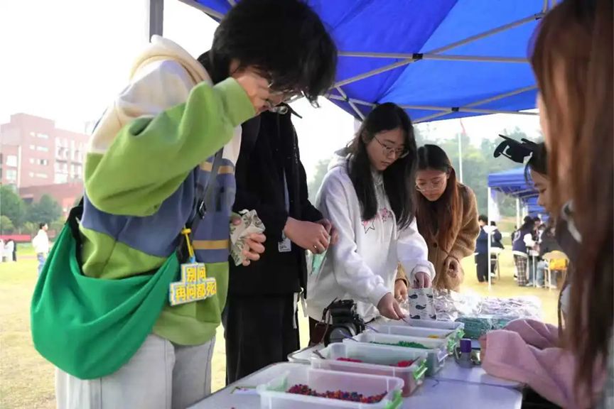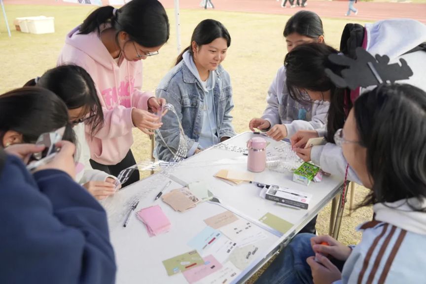 晨光体育场上,本届心理游园会分“运动赋能”“手作疗愈”两大篇章,八个子项目同步开放:前者以“障碍对抗赛”“情绪沙包”“巨型飞行棋”让学子在奔跑跳跃中释放压力;后者以“夸夸镜”“漂流瓶”“任意门”“香囊”“拼贴诗”引导大家以绘、写、闻、藏疗愈内心,动静交织,于欢笑与静思间实现润心成长。