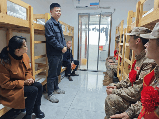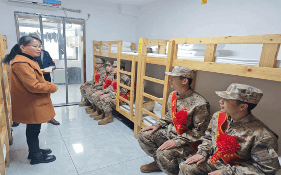 甘叶青副处长一行首先参观了新兵宿舍,认真听取基地老师关于新兵学习、训练情况的介绍,详细了解5名新兵的役前适应状态,并与新兵们亲切座谈,关切询问他们的生活需求与思想动态,鼓励大家坚定信念、刻苦训练,以良好状态迎接军营生活。