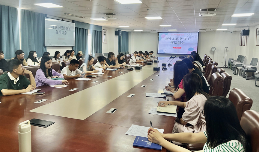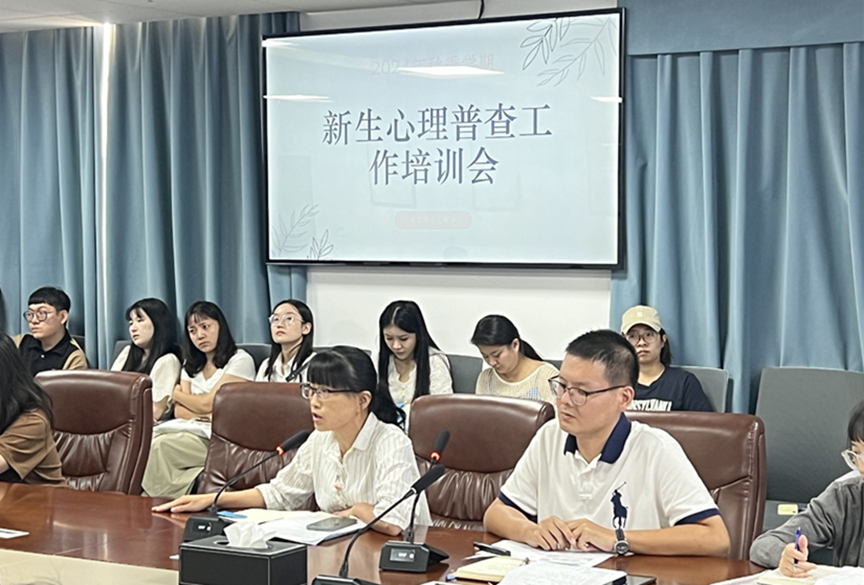 为积极响应教育厅关于规范心理测评的指导精神,健全筛查预警机制,及早实施精准干预,积极开展高校新生入校心理健康测评工作, 9月27日上午,我院2024年秋季学期新生心理普查工作培训会在行知楼六楼会议室召开。学生工作处负责人甘叶青及全体2024级新生辅导员、二级学院心理专干和心理中心专职心理咨询师参会。会议由心理中心王汪主持。