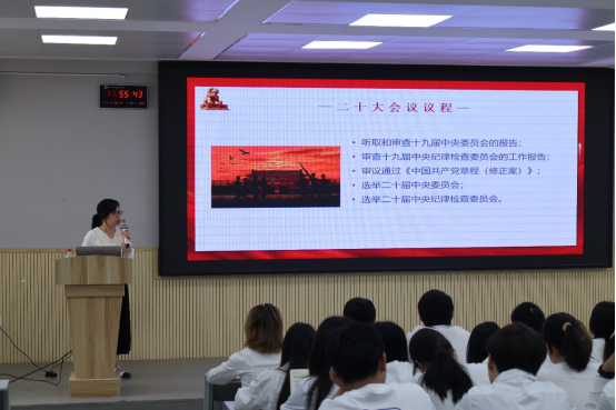 肖爱萍老师从党的二十大大会议程、大会主题、大会内容等方面向我们全方面讲解了二十大的相关知识,强调要高举中国特色社会主义伟大旗帜,深入学习贯彻习近平总书记系列重要讲话精神,衷心拥护“两个确立”、忠诚践行“两个维护”,鼓励学员们要积极学习宣传贯彻党的二十大精神,自信自强、 守正创新、踔厉奋发、勇毅前行,为全面建设社会主义现代化国家而团结奋斗。