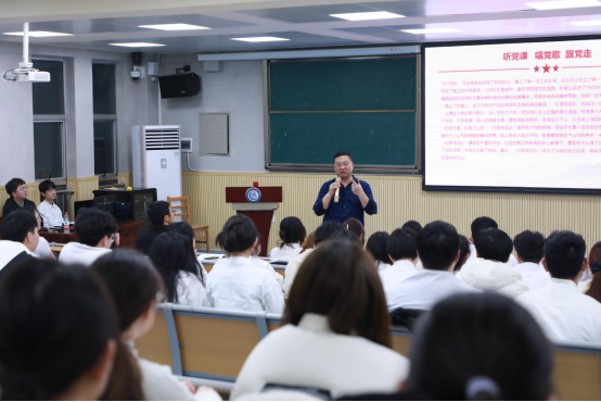 学院党委委员、董事长朱定强将家喻户晓的红色歌曲与经典的红色视频素材同中国共产党一百多年来的革命历程紧密结合,用一首首红色作品带领学员们走进党的百年光辉历程,向学员们绘声绘色地讲述了党的革命历史、革命理想与背后激人奋进的党史故事,深化了全体学员对毛泽东思想、邓小平理论、“三个代表”重要思想、科学发展观、习近平新时代中国特色社会主义思想的深刻认识,将战争年代催人奋进的号角转为新时代抒发理想信念的强音,带领全体预备党员“听党课、唱党歌、跟党走”。