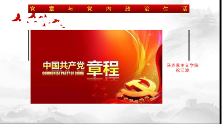 祝江波老师从“学习党章的必要性”“党章的发展历程”“党章的总纲”“党章的条文”“学习十九大党章”“《关于新形势下党内政治生活的若干准则》”六个主题切入,对《中国共产党章程》进行了详细讲解。祝老师指出,《党章》是各级党组织坚持从严治党的根本依据,也是全体党员加强党性修养的根本标准,认真学习贯彻党章,既是学习贯彻中国共产党精神的应有之义,也是加强和改进党的建设的重要基础性工作。