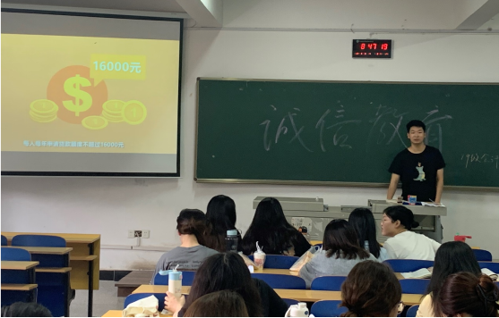 接着辅导员以“征信知识进校园”为主要内容,将诚信教育主题活动与国家助学贷款申请、续贷、还款工作结合进行宣讲,同时融入了预防金融诈骗等内容,着力提高学生的诚信意识、风险意识,促进国家助学贷款工作健康持续开展。