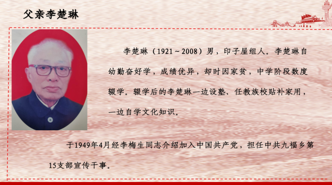 李老以朴实的话语,通过对100年前后的中国状况对比,生动讲述了百年来中国共产党带领全国人民如何将我们的国家从一个民不聊生的弱国蜕变成如今欣欣向荣的强国。李老带领全体学员重温“红船精神”,“长征精神”,“延安精神”,“井冈山精神”,“雷锋精神”,让大家对如何成为一个合格的党员有了一个全新的认识。李老还讲述了其伯父——革命烈士李楚藩和革命壮士李楚英,以及其父亲李楚琳的革命英雄事迹,叮嘱我们青年人要珍惜现在的美好生活,坚定崇高的理想信念,传承红色基因,赓续红色精神,学史明理,学史增信,为中华民族的伟大复兴而努力奋斗。