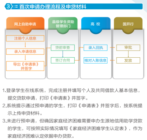 在校生第一次办理生源地助学贷款流程和所需资料如下: