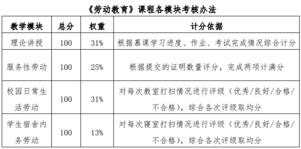 《劳动教育》课程由学生工作处统筹实施,任课教师根据《劳动教育》课程教学大纲规定的考核办法执行,每学期做好材料存档工作。《劳动教育》课程的最终考核结果由任课教师于2024年秋季学期结束前录入教务系统。
