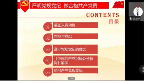 胡文静老师以“端正入党动机”“党规与党纪”“遵守党规党纪的意义”“《中国共产党纪律处分条例》解读”“如何严守党规党纪”五个方面为分讲点,论述了如何做一名合格的党员,希望各位学员能够进一步端正入党动机,持续提高思想政治素质和政治理论水平。