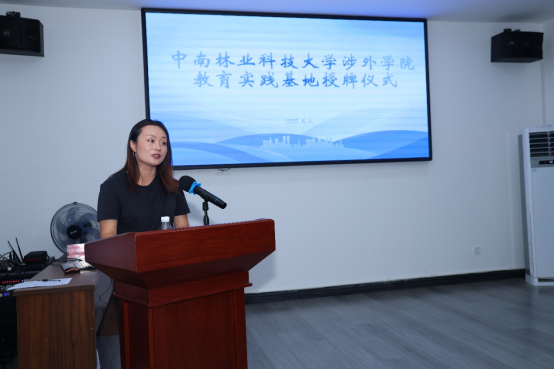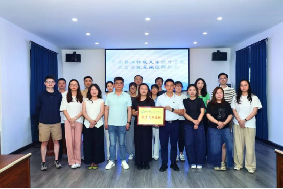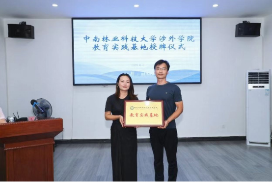 最后,范伶俐处长向基地负责人蒋向明授予"中南林业科技大学涉外学院教育实践基地"牌匾,标志着校地协同育人开启新程。